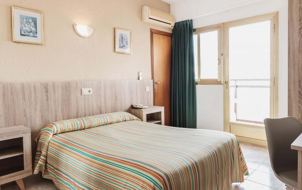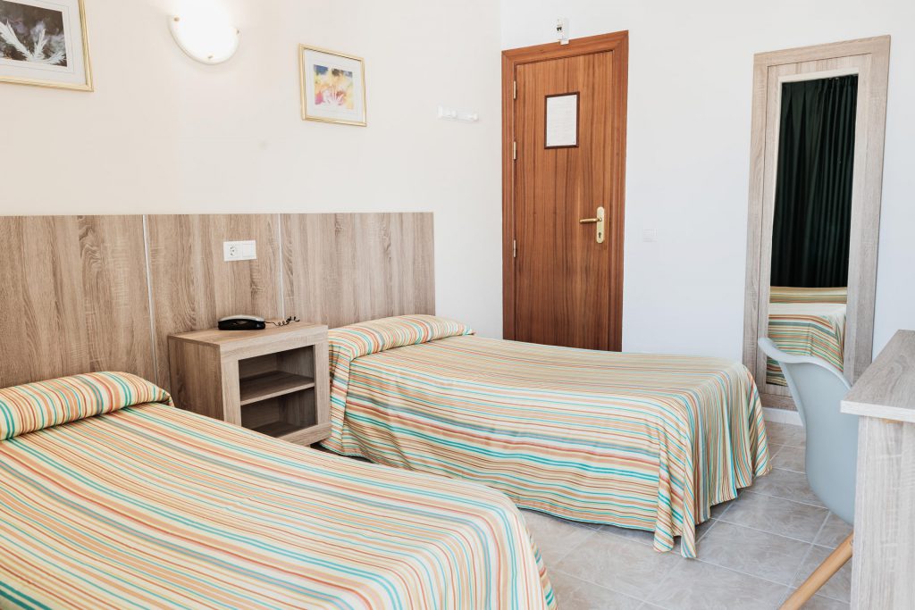 Habitación con una cama doble o dos individuales, armario y escritorio. Esta habitación tiene terraza con vistas a la piscina o la calle. Los baños de las habitaciones disponen de plato de ducha o bañera.